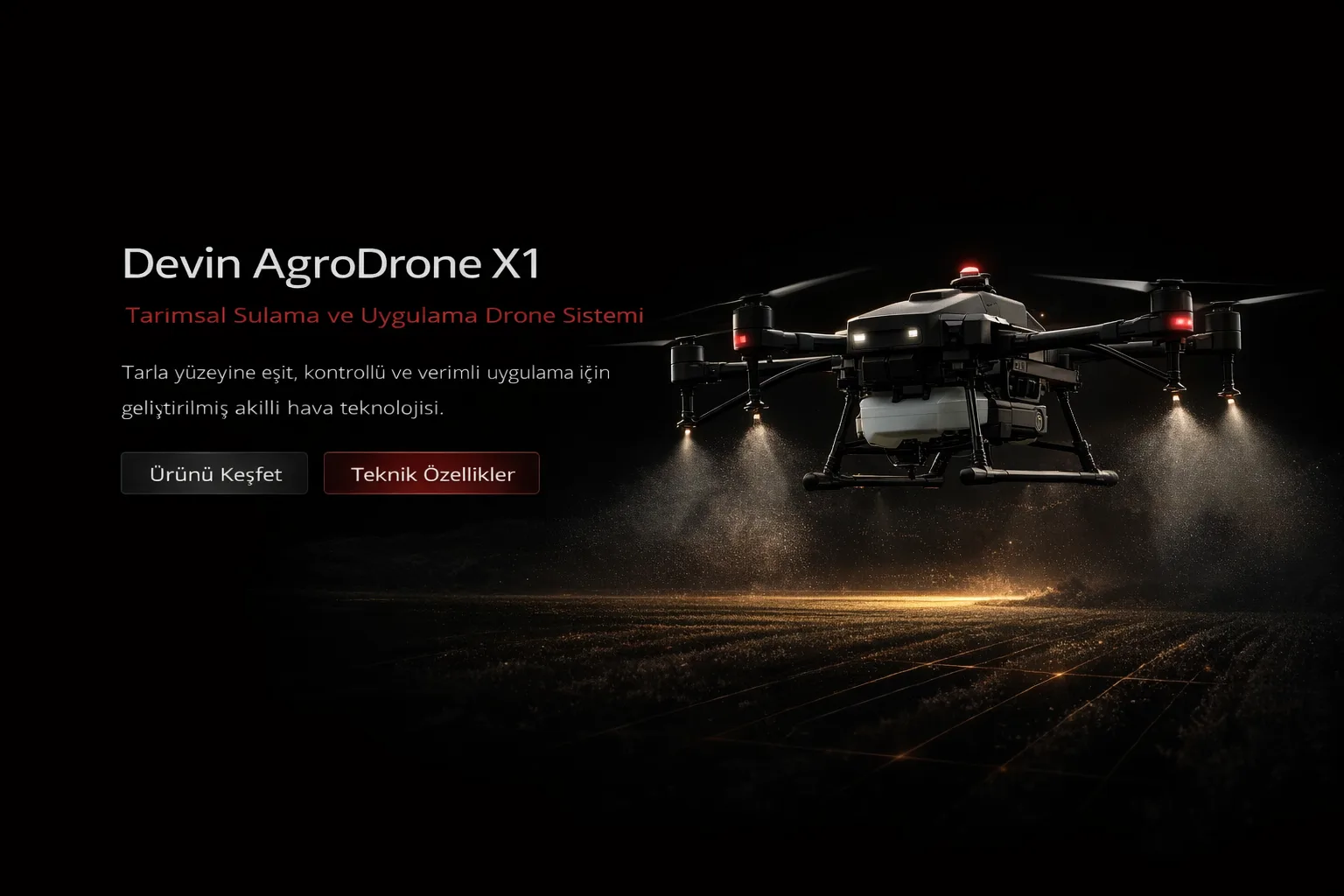 Devin AgroDrone X1, tarla üstü sulama ve ilaçlama görevlerini akıllı şekilde yürüten bir tarım drone’udur. Sensör destekli algılama ve denetimli uçuşla üreticilerin işini kolaylaştırır, verimi artırır.