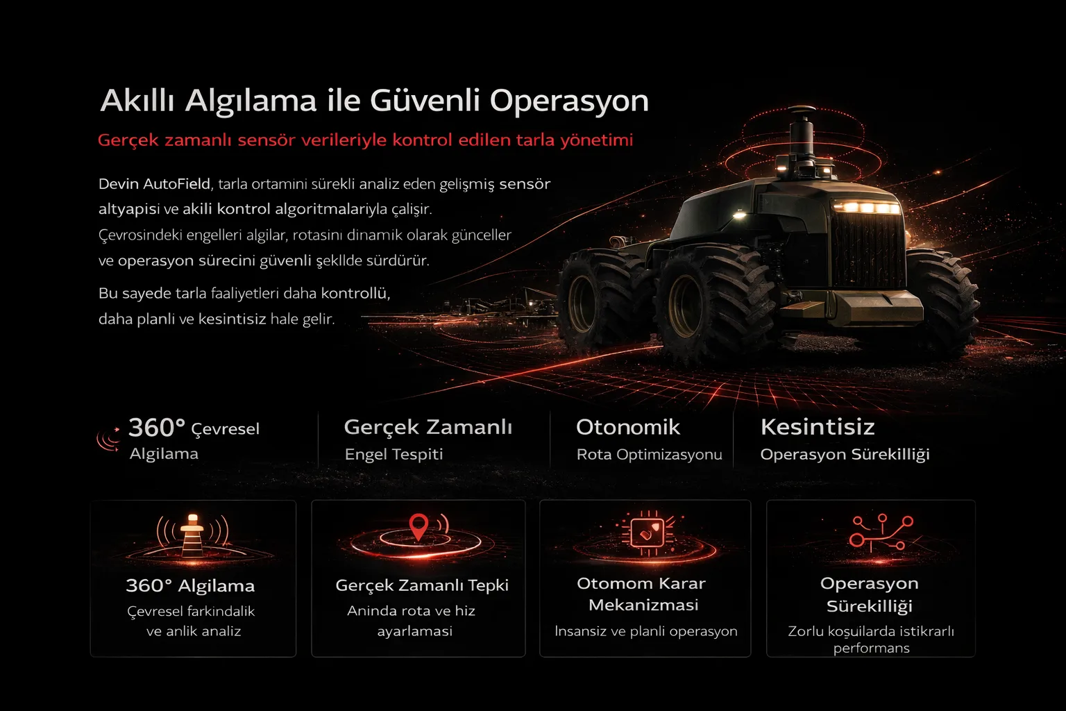 Devin AutoField, tarımsal faaliyetleri sahada otonom şekilde gerçekleştirirken, üreticiye uzaktan ve kontrollü bir yönetim deneyimi sunar. Tablet veya mobil cihaz üzerinden tanımlanan görevler, araç tarafından hassas ve planlı şekilde uygulanır.